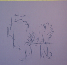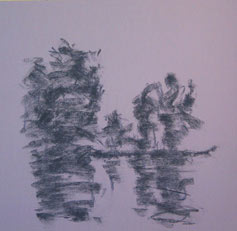 Next, I block in sky and water, but not as light in value as they will eventually be. I save the lightest lights and darkest darks for last. I cut into the negative areas left behind by the trees and water. Later I will adjust the positive -- back and forth until I achieve the effect I want. Remember that the positive and negative spaces hold equal importance. |