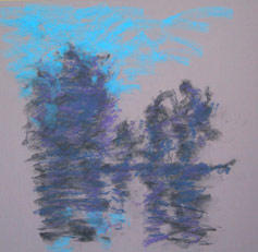 With a dark blue-gray pastel I work out the largest shapes first. I have elected to lower the overall horizon to reveal more sky.