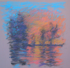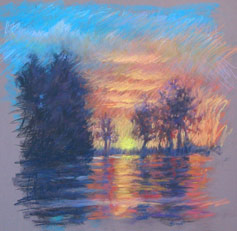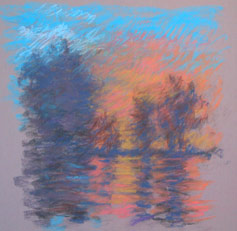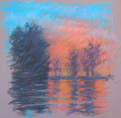 PLANNING THE PAINTING: I'll start with a piece of standard 19.5" x 25" Canson paper in a medium-value violet. This color complements the oranges. The painting overall will be low-key. To avoid having to cover a light paper with so much pastel, I start with this darker value. All the colors will "read" at all times, therefore, this paper color works best for me. In addition, the violet reads as "warm" even though it is an overall cool color. I use the "felt" side of the paper, so I do not have to fight the machined "dimples" of the opposite side. I use Homasote as my backing board surface with several additional sheets of the same Canson paper under my painting. This allows the surface some "give" yet is not mushy. If I paint on the Canson without extra pieces behind it, it will be like painting on a brick. Much pastel can be wasted without this extra cushion. |