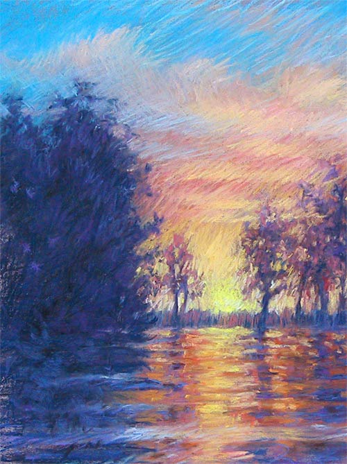 Now that the composition and basic colors are in, I indicate the sun and work more carefully in each area, comparing values, colors and intensities to one another. I constantly work to "knit" the colors using the edge of my pastel, laying colors side-by-side or grazing over top. This is how I avoid having to blend. I want the colors to be lively and rich even when they are dark. Working this way also keeps my colors clean.