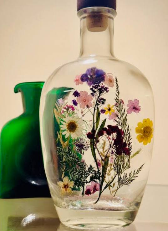Students will decoupage dried flowers over glass vases. Students will have the option to pick out a color palette from blue and yellow flowers. A mix of colors will be offered. The result is a beautiful, personally crafted art expression on glass. Great for gift giving! All supplies except for the bottle are included in the price of tuition. Students can bring their own glass bottle or vase that is 90% smooth. (Some raised letters and symbols are permissible.) Or students may purchase a bottle from the instructor for $5.