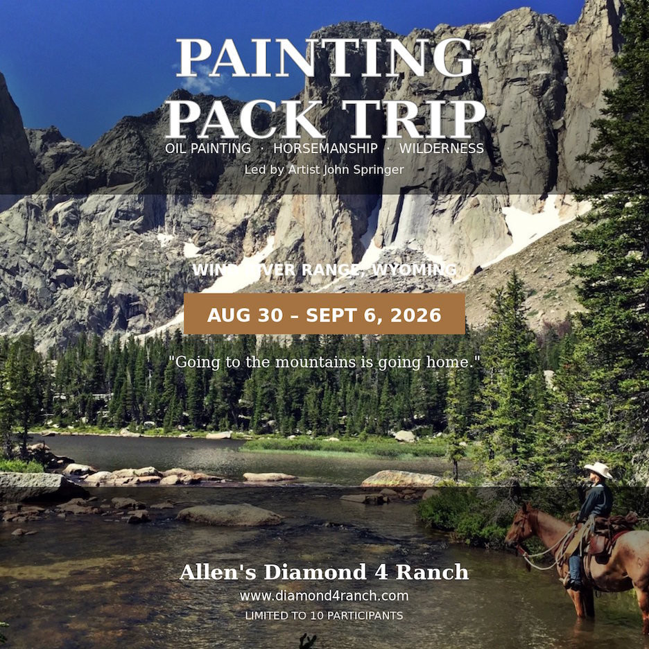 Join the Diamond 4 Ranch and artist John Springer to experience the grandeur of the American wilderness through the practice of oil painting. With the support of horse-pack, we will have the rare opportunity to create artwork deep within the mountains. Together we'll experience what John Muir knew: "Going to the mountains is going home." This trip is limited to 10 participants. We will spend the first three nights based from cabins, then we'll camp for three nights, and our final night will be back in the cabins. A family outfitter guiding the Wind Rivers for three generations. Licensed by USFS since 1973.