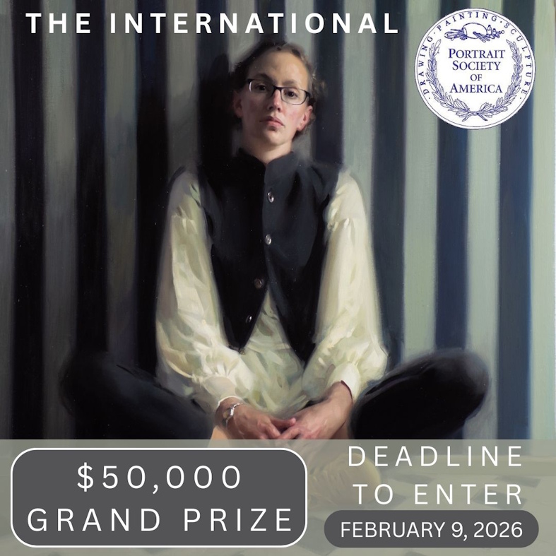 Artists worldwide are invited to submit artwork for the 28th annual "The International" portrait competition, that will showcase the finest in portraiture and figurative art today. Over $170,000 in cash and awards will be presented, with a $50,000 cash Grand Prize. All winners will receive recognition in International Artist magazine, The Art of the Portrait journal and on the Portrait Society's website. A variety of mediums is encouraged and welcomed. Finalists are required to exhibit their selected original artwork and be present at the prestigious The Art of the Portrait conference in Atlanta, GA, April 9-12, 2026 for final judging and awards (Finalists announced on March 2nd). $55 for up to 3 entries. Deadline: midnight (EST) on February 9, 2026. More info. Contact: email or call 877-772-4321.National