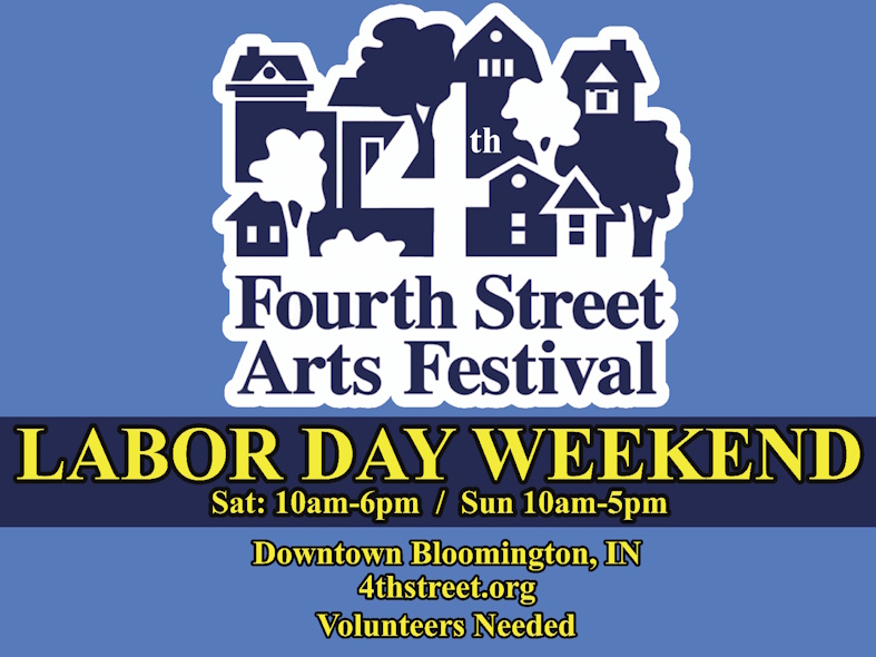 Artists from across the country are invited to apply for the Fourth Street Festival of the Arts and Crafts, held September 5-6, 2026 (Labor Day Weekend) in Bloomington, IN. $3,000 in awards. No mass produced or factory made work is permitted. All work must be designed and created by the artist. Eligible media includes: Ceramics, Fiber, Glass, 2D/2D Mixed Media, Jewelry, Painting, Photography (signed and numbered as a limited edition), Sculpture/3D Mixed Media, and Wood. $35 Application Fee. Deadline: April 20, 2026. More info. Contact: email or call 812-575-0484.Regional