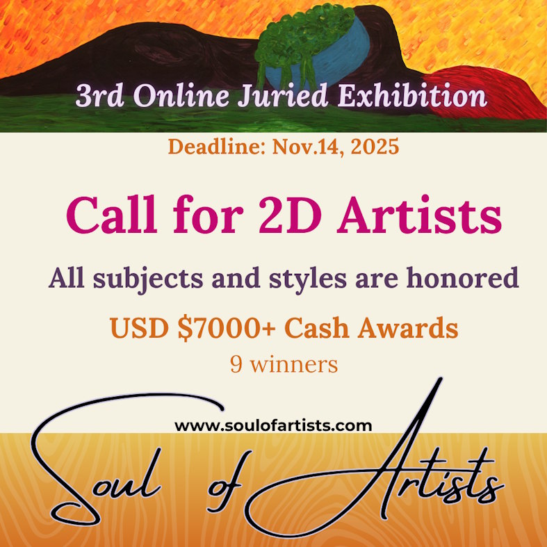 Soul of Artists announces a call to artists for their 3rd annual art competition. All winners will be featured in a full-year online exhibition, February 28, 2026 - February 28, 2027. $7,000+ in Cash Awards. 3 Winners - $2,000 each. 6 Runners-up - $300 each. Any subject. Any style. If you're a 2D artist who has poured time and effort into building an authentic body of work that feels true and alive then we want to see it. Artists from every country and culture are invited to submit. We are looking for exceptionalism of expression. Open to all artists aged 18+. Original 2D works only. No digital-only art. Entry fee: $36 USD. Deadline: November 14, 2025. More info. Contact: email or call (661) 450-8209.International