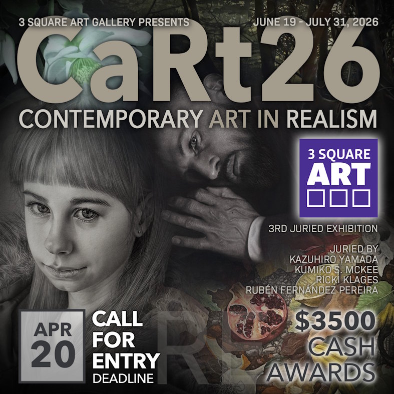 3 Square Art Gallery in Fort Collins, CO announces a call to artists for a juried art exhibition, June 19 - July 31, 2026. $3500 in awards. Jurors: Kazuhiro Yamada, Kumiko S. McKee, Ricki Klages, Rubén Fernández Pereira. Traditional media only: Painting, Drawing, Sculpture, Printmaking (drawing-based). No digital art, photography, AI-generated elements, or reproductions. $65 entry fee. Deadline: April 20, 2026. More info. Contact: email or call 1-970-388-1969.International