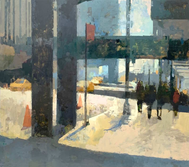 Capture the mood and abstract nature of the urban landscape using oil paint and charcoal from photo references. Use drawing to build structure and form in combination with paint to create interesting textures and atmosphere.