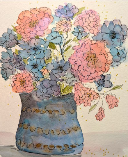 Let’s make flowers! Let’s start by using watercolors and create a bouquet blending colors. Once dry, we’ll pick up our pens, markers, and gouache (or anything else we want) to create interesting playful flowers. We’ll add some splashes of gold, silver, or white! It’s a relaxing experience to just make things up. All artistic levels welcome!