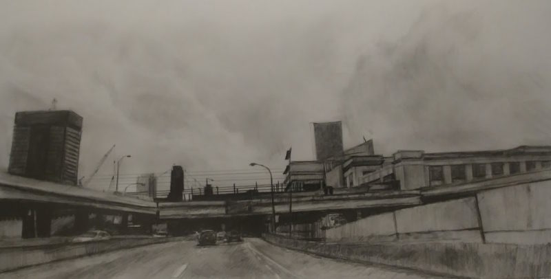 Capture the mood and abstract nature of the urban landscape using oil paint and charcoal from photo references. Use drawing to build structure and form in combination with paint to create interesting textures and atmosphere.