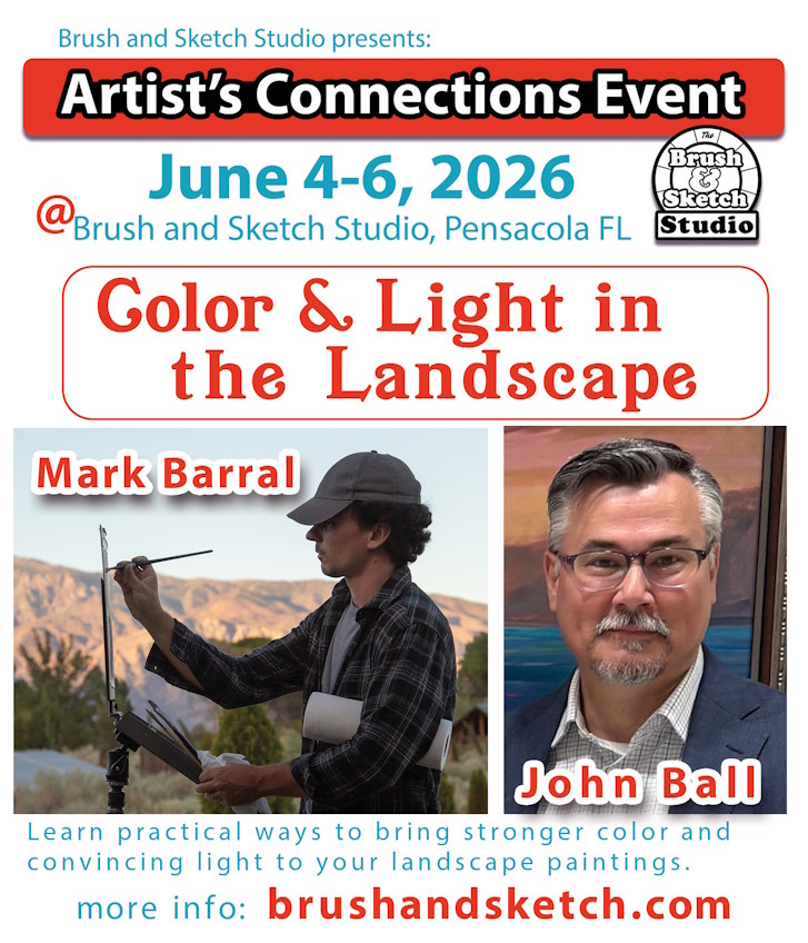 Join professional painters John Ball and Mark Baral for Color and Light in the Landscape, an Artist’s Connection Event at the Brush and Sketch Studio in Pensacola, FL. Through demonstrations, discussion, and critique, the artists will explore how light and color shape the landscape, how figures can strengthen a landscape composition, and how studio paintings are developed from plein air sketches and studies. Attendees are also encouraged to bring their own landscape sketches for thoughtful feedback and problem solving. This welcoming event is designed to help artists gain practical insight, fresh ideas, and meaningful connections with fellow painters.
