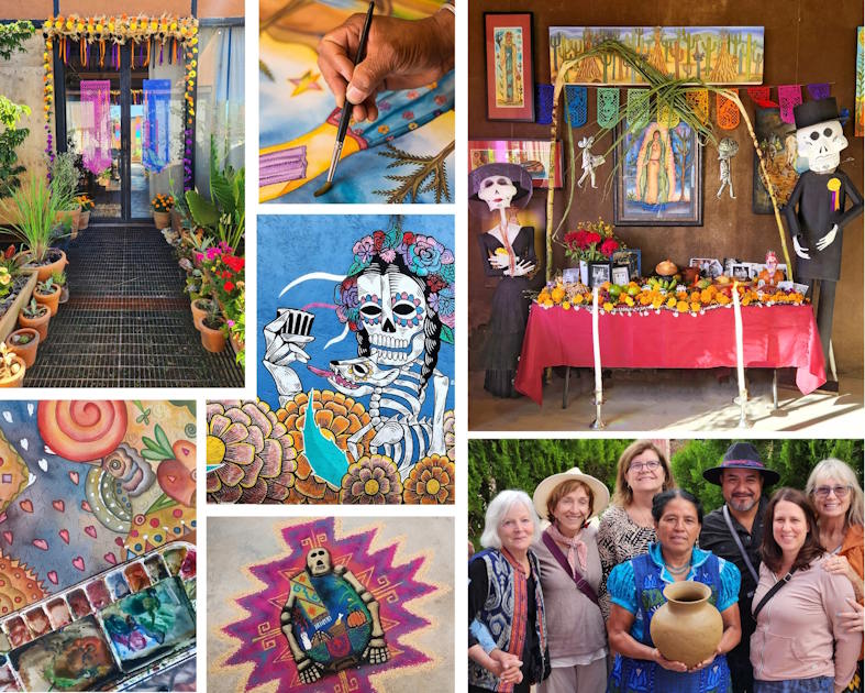 Experience an unforgettable celebration of Día de Muertos in magical, traditional Oaxaca, with stunningly decorated altars, street parades with vibrant music, costumed revelers, all-night vigils in local cemeteries, marigold flowers, copal incense, pan de Muertos, and dazzling murals throughout the city. We will spend our days watercolor painting imagery and symbolic representations of our loved ones, assemble a beautiful group altar, and construct and decorate a sand tapestry. We'll go to a traditional market to collect altar decorations and offerings, make visits to two cemeteries where Oaxaqueños lovingly decorate the graves of their ancestors and bring offerings to share with their spirits. Additional field trips include master weaving family, alebrije (carved wooden objects) artisans, and women’s red clay collective.