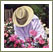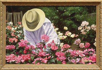 This painting of a gardener tending to her roses is framed as shown in a traditional style, gold-leafed wood frame (2.25" wide).