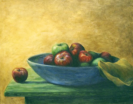 In this informal still life painting the simplicity of the yellow background sets off the fruit and enhances the bold color palette.
