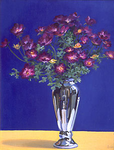 This painting has bold and cheerful colors. It is framed in an attractive contemporary gold-leafed wood frame (2.5" wide).