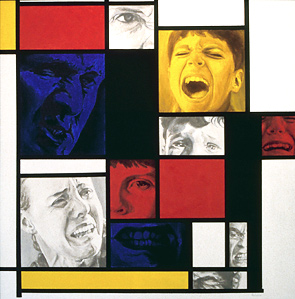 This contemporary painting has a grid style composition that emulates the work of the famous modernist painter Piet Mondrian. It is a statement about the fragmentation of dysfunctional families - a visual representation of the ever-present disconnect and the sense of isolation that ensues.