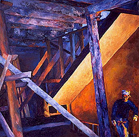 Sometimes scenes of destruction possess an odd beauty, as is the case in this painting which depicts the tearing down of walls at a construction site. This piece was painted with a palette knife, creating a thick impasto to complement the rough setting.
