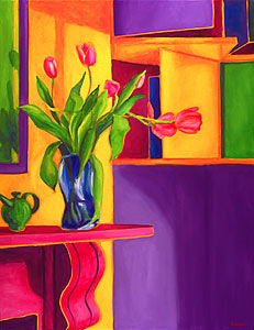 This bold contemporary painting has a strong compositional structure and radiates with color.