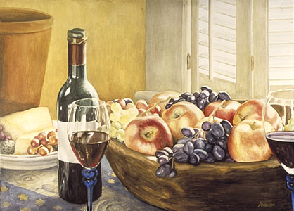 The painting evokes the warmth of a sun-filled afternoon as it captures the play of sunlight dancing across the surfaces of the fruit and glass.