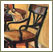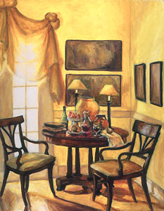 The backlighting and warm sunny yellows in this painting create an inviting scene. It is framed in an attractive contemporary gold-leafed wood frame (5" wide).