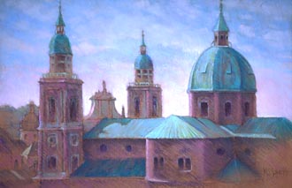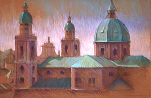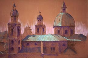 Stage Four: All delicate glazing touches here. Lots of hard pastel in use--Faber Castell or NuPastel, or Rembrandt. Warm the blue greens further with a yellow-green Schmincke. Deepen the shadows with darkest brown soft pastels, under eaves and in windows. Add rose to the half-tones on the turret. Hatch the sky with a near-white pale cerulean blue (Rembrandt). Add a deep-red glaze to the shadows on the stone walls. Rosy-up the skyline, just above the domes. Quit! |