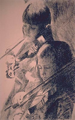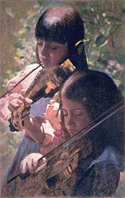 | The completed painting is mostly mid-tone to dark in value. I want the small areas of light to be very prominent. I liked this particular composition because the girls are positioned diagonally to the left, and the violins are positioned diagonally to the right. I made the background blurred to give the illusion of depth. Placing the small branch and leaf in front of the taller girl achieved the same effect. I like light and dark contrast, pattern, and texture in my paintings and this particular setting included a combination of all those qualities. |