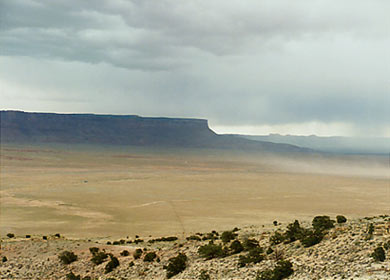 Viewed from a hill top, the storm races across the valley near Page, Arizona.