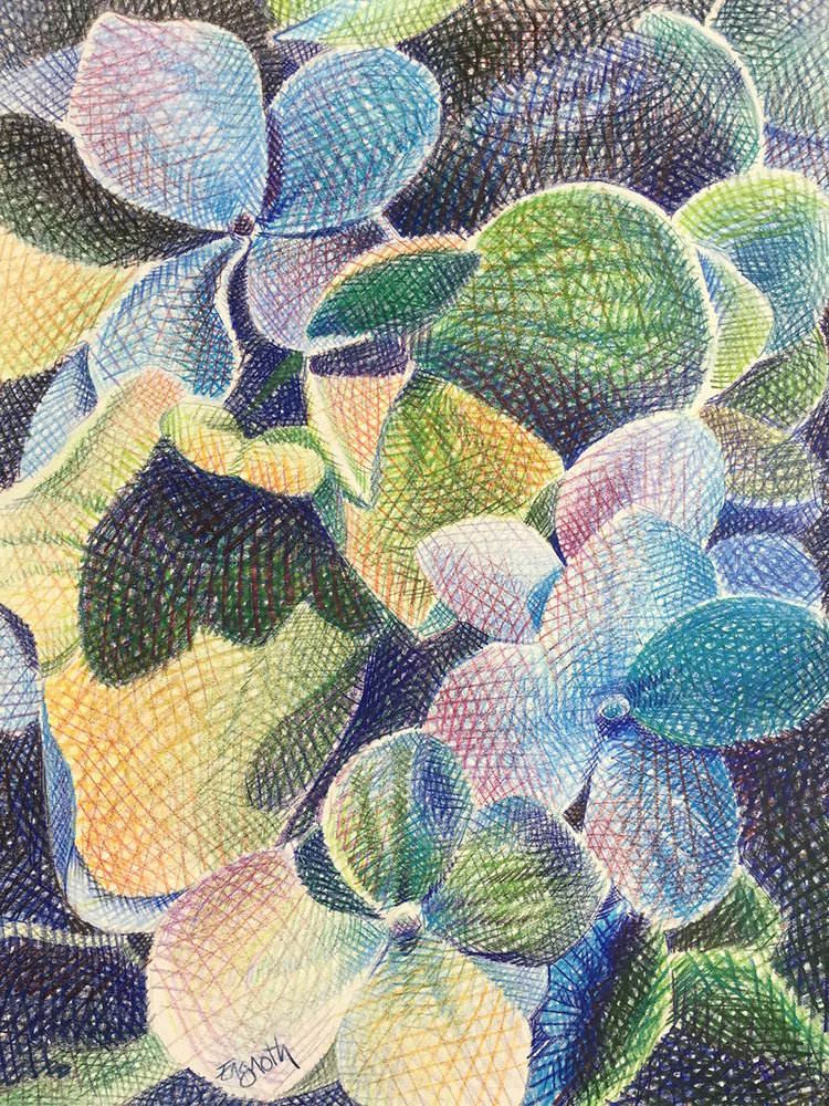 Drawing media include traditional and watersoluble colored pencils, charcoal, conté, pen & ink, markers, and watercolor pencils. Though drawings are frequently thought of in terms of linear expression, they often depict value and form with a build-up of hatched and crosshatched lines or through continuous gradations of tone. They range from simple black and white renderings to full color images.