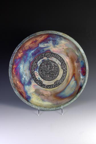 These large, hand thrown platters (designed for stands or to be hung on walls) are rare finds….platters of this size rarely survive the raku process. It took 2 years of experimentation to refine the process to achieve results like these.