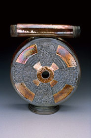Ichirin is Japanese for "wheel", the base form for this series. Celtic cross inspired designs are made with slip trails and incisions using various found objects. Ferric chloride is added to the white crackle glaze during the firing (DON'T try that at home) to give the iron-like finish. Each piece combines wheel thrown, slab, hand built, and extruded elements, and are very time intensive to make.