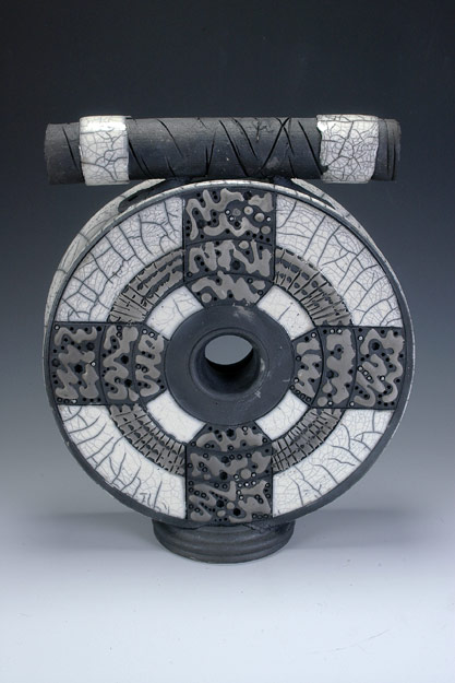 Ichirin is Japanese for "wheel", the base form for this series. Celtic cross inspired designs are made with slip trails and incisions using various found objects. Each piece combines wheel thrown, slab, hand built, and extruded elements, and are very time intensive to make.