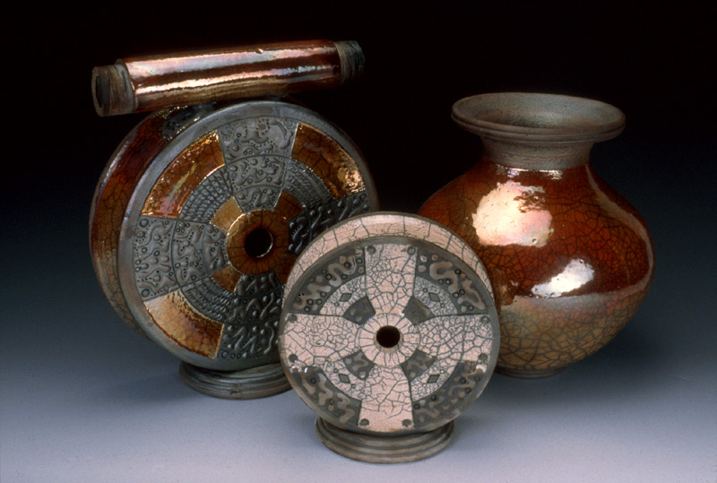 The image shown is a representative sample of the raku-fired pottery made by Steven S. Fitzgerald at FireStorm Clayworks. All works are hand-made ceramic, using the wheel, handbuilding, an extruder, and/or a slab roller….no molds or slipcasting are involved.