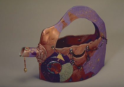 This mixed media teapot is made of Raku clay, rice paper, beads and watercolors. Previous image | Next image [ Artshow.com | Sheila's Portfolio | Raku Interview | Artist's Biography | Contact Information ] copyright © 2001 Artshow.com. All rights reserved. |
