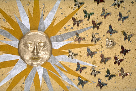 This mixed media collage is made of Raku clay and rice paper. The butterflies are escorting a tiny angel to heaven.