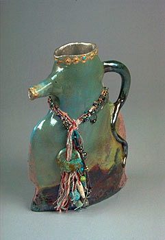This mixed media teapot is made of Raku clay, rice paper, and beads.