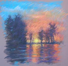 Now that the composition and basic colors are in, I indicate the sun and work more carefully in each area, comparing values, colors and intensities to one another. I constantly work to "knit" the colors using the edge of my pastel, laying colors side-by-side or grazing over top. This is how I avoid having to blend. I want the colors to be lively and rich even when they are dark. Working this way also keeps my colors clean.