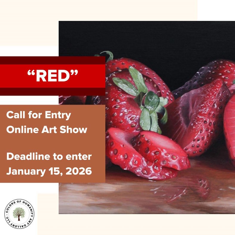 Colors of Humanity Art Gallery seeks entries for an online art exhibition, February 1-28, 2026. Cash Award for Best of Show. Juror: Janelle Cogan. Theme: "Red" This color is symbolic for many different things and emotions. It is most commonly associated with heat, activity, passion, sexuality, anger, love, joy, and, in some cultures, it is the color of happiness. We want to see your interpretation. We will be donating 10% of all entry fees to the Red Cross, the world's largest humanitarian organization, providing assistance without discrimination as to nationality, race, religious beliefs, class or political opinions. All artists 18 and over may enter. $20 for 1 or 2 pieces (You may enter more than once.) Deadline: January 15, 2026. More info. Contact: emailInternational