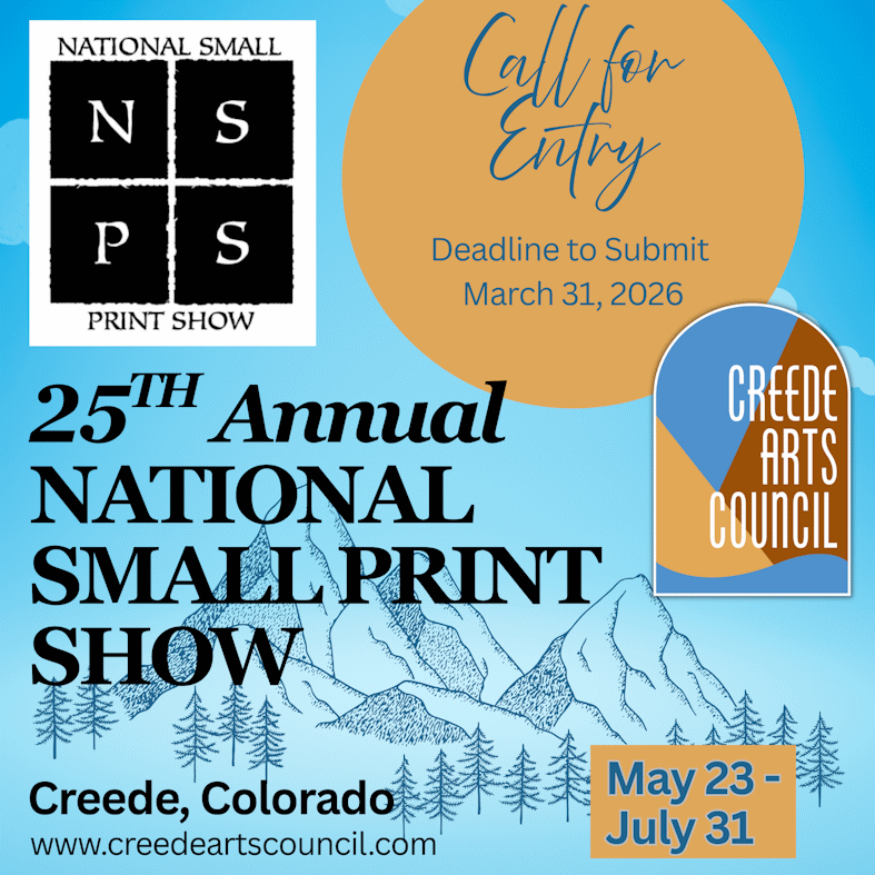 The Creede Arts Council announces a call to artists for their annual National Small Print Show, a juried art show of matted hand-pulled prints held as a live exhibit at the Creede Repertory Theatre lobby in Creede, Colorado and as a virtual show, May 23 - July 31, 2026. Cash awards for Best in Show, 2nd and 3rd Place and for Two Honorable Mentions. Artists from all 50 states and Canada are invited to submit up to 3 original prints to exhibit and sell. Matted hand pulled prints - Monotype, Linocut, Lithograph, Woodcut, Aquatint & more (see our website for guidelines). $40 entry fee. Deadline: March 31, 2026. More info. Contact: email or call 719-658-0312.Regional