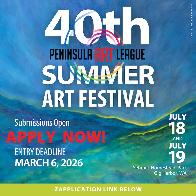 The Peninsula Art League seeks artists for the 40th Summer Art Festival, July 18 & 19, 2026 at Sehmel Homestead Park in Gig Harbor, WA. Eligible media: Painting, Ceramics, Photography, Woodworking, Metal, Sculpture, Printmaking, Drawing, Fiber Art/Textiles, Jewelry, Garden Art, Mosaic, Glass Art, Mixed Media, and Basketry. $30 application fee. Deadline: March 6, 2026. More info. Contact: email or call 253-878-2070.International