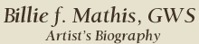 Billie f. Mathis has been painting for 37 years and has been a resident for the last seven years in the foothills of the Blue Ridge Mountains, Waleska, Georgia. Billie completed a 4-year study in Commercial Art with Art Instruction, Inc. Minneapolis, MN. She also has studied with many nationally and internationally renowned watercolorists in the fine arts field. Her paintings have been juried into many national competitions throughout the years as well as regional exhibits. She has received numerous awards and has had several solo exhibits. Her work is collected in many corporate collections, state collections, and private collections throughout the United States, also in German and Turkey. She is a signature member, a life member, and the coordinator of the Regional Directors of the Georgia Watercolor Society. Her invitational memberships include Who's Who in American Art, Who's Who in American Women of the Arts, Who's Who in the International Biographies of Artists, Marietta/Cobb Museum of Art, Arts Alliance of Georgia, Cherokee Arts Council and The Art Guild. She has illustrated two children's poetry books, "The Break of Day" and "Looking Through My Window". She has been included in many publications and featured on the cover of an international magazine. |